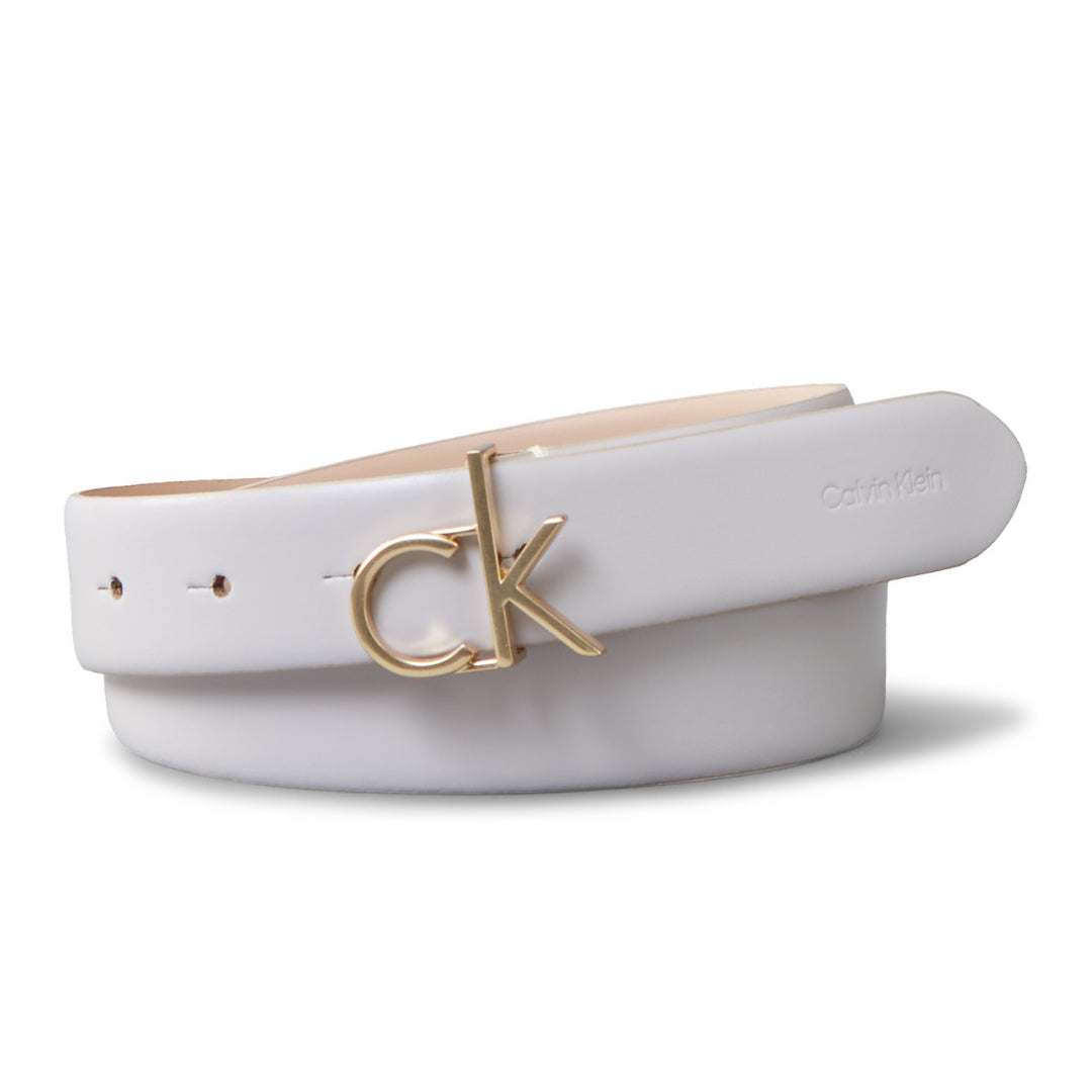 Ceinture femme signée Calvin Klein, largeur 30 mm, cuir véritable, boucle métallique gravée du logo « CK ». Un accessoire minimaliste chic, adapté tant aux tenues casual que plus habillées.